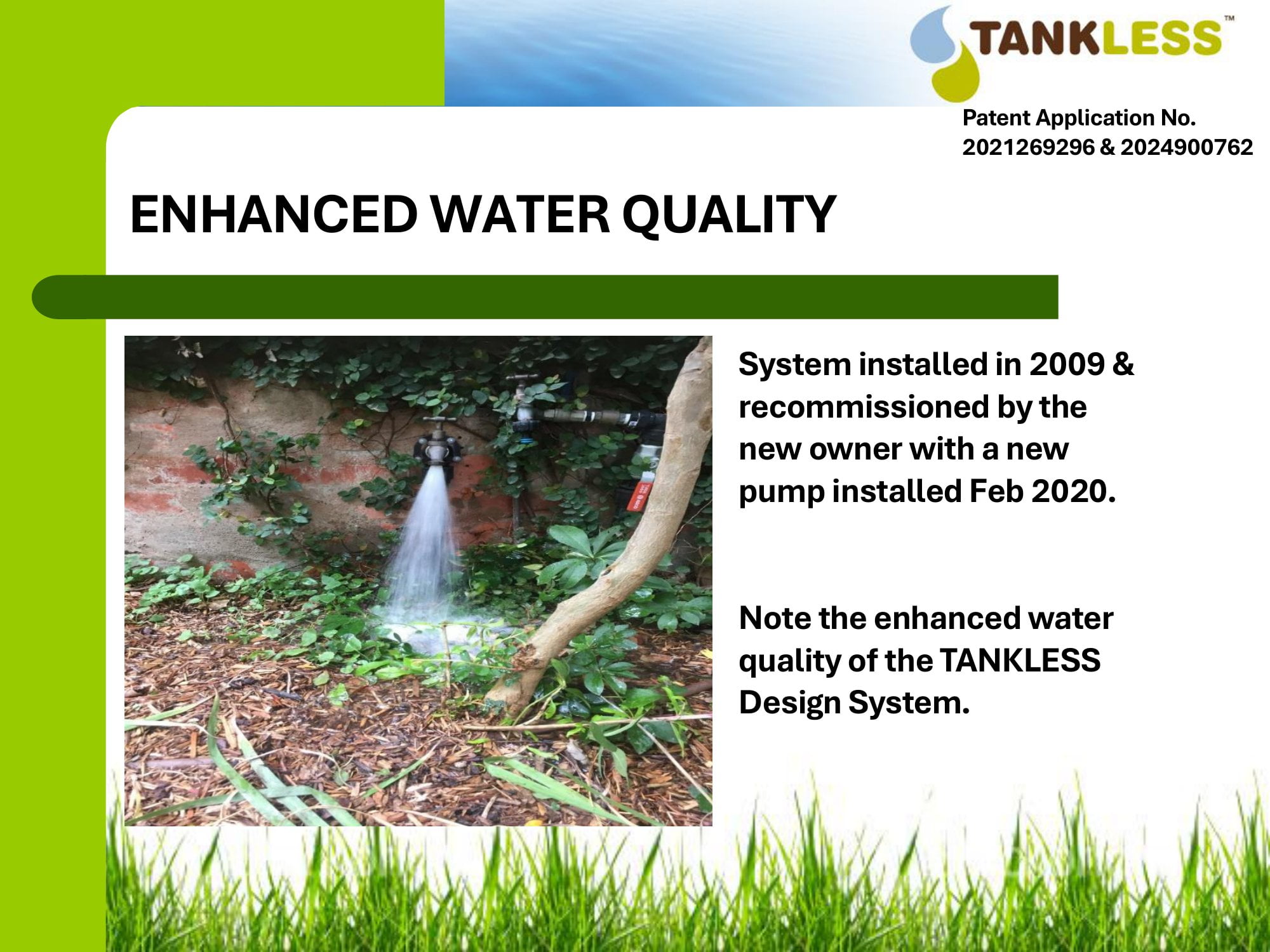 Maximise every drop for Irrigation ,Household use ,Fire protection. Be ready ,Be water wise, Be protected. Tankless features Flexibility, Safety & Durability. Market leader in unique design minimises the access point to protect your family & pets yet still delivers exceptional flow of water through clever innovation.
